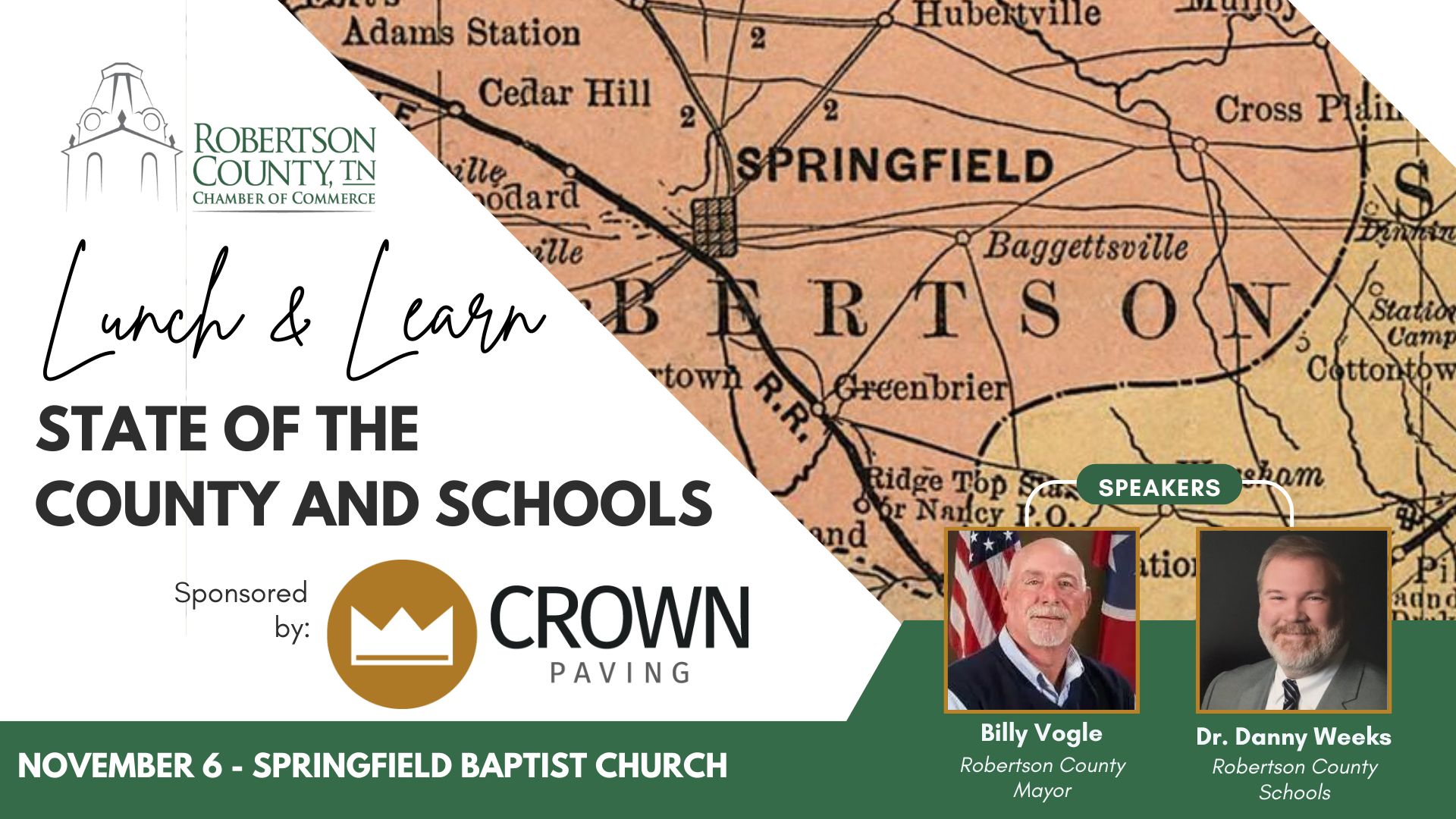 Bring your appetite and your curiosity! Join us as Mayor Billy Vogle and Director of Schools Dr. Danny Weeks dish out the latest on what’s ahead for Robertson County and our schools. Good food + big insights = a lunch hour well spent. 06/11/2025